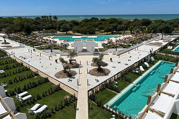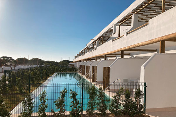 Circa 10 Minuten mit dem Auto entfernt liegt das im Sommer 2024 eröffnete Öko Resort Punta Candor Suites im Aussenbereich der Stadt Rota. Nur durch die Uferstrasse vom Atlantik getrennt gefällt eine architektonisch geschickt konzipierte Anlage, die sich mit drei Stockwerken Bauhöhe perfekt in die Küstenlinie integriert. Der Bau ist technisch auf dem neuesten Stand, gut durchdacht und bietet den Gästen durch ein klar beschildertes Leitsystem jederzeit die notwendige Orientierung. Durch die stufenartige Anordnung der Wohnetagen verliert sich der im großzügig gestalteten Innenbereich entstehende Schall der Pool Landschaft. Die erhöht gemauerten, weiß gestrichenen Geländer der Balkone unterstützen den schalldämmenden Effekt zusätzlich, ebenso wie die stärker dimensionierten Wände zwischen den einzelnen Apartments, die gedämmten Decken und Böden der Wohnräume.