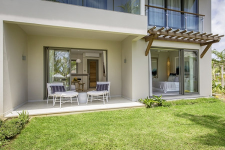 Die Junior Suites mit ca. 60 qm, die am ersten Fairway des Ernie Els Platzes liegen, haben einen eigenen überdachten Eingang, eine Küchenzeile mit Esstheke, einen gemütlichen Wohnbereich und eine Veranda mit Sitzecke mit Blick auf den wunderschön angelegten Garten und auf Loch Nr. 1 und 9.